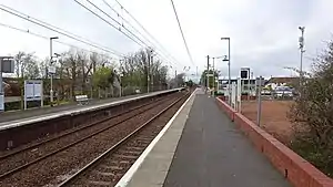 Barassie station originally had four platforms, two of which were on the former Kilmarnock and Troon Railway line from Kilmarnock. These platforms went out of use after the local passenger service over the branch was withdrawn by British Rail on 3 March 1969.[3] They are now derelict & fenced off, but the two platforms on the Ayr line are still operational today. Barassie was a staffed station until the line was electrified in 1986, but the main buildings have since been demolished and there are now only waiting shelters in use on each platform.