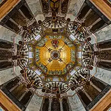 The Barbarossa Chandelier was made of gilt copper in the form of a wheel chandelier. It has a diameter of 4.20 metres and is mounted on a roughly 27 metre long chain under the middle of the roof of the Palatine chapel - the Carolingian Octagon of the Cathedral. Reports that the original chain from Carolingian times is incorporated into the current chain are not true, since the links of the chain taper downwards. The chain links are tapered toward the bottom from a length of 150mm to 130mm and of a width of 74mm to 70mm. As a result, the impression when viewed from below is that the entire length of the chain has the same thickness. The chandelier, floating about four metres above the marble floor, is composed of eight curved segments, thereby conforming to the octagonal shape of the Palatine chapel. The circle of the wheel chandelier symbolises the city wall of the New Jerusalem. The stylised city wall of the chandelier contains eight large and eight small gate towers, which are arranged symmetrically. Because of the octagonal structure of the surrounding building, the traditional depiction of the Heavenly Jerusalem with only twelve towers was precluded.