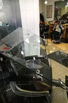 Barack Obama's bulletproof glass-encased barber chair at Hyde Park Hair Salon in Chicago