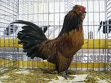 The Barbu de Watermael, Dutch: Watermaalse Baardkriel, is a Belgian breed of bantam chicken. It originated in the Belgian town of Watermael-Boitsfort (Dutch: Watermaal-Bosvoorde), from which it takes its name, which means "bearded [chicken] from Watermael". It is closely related to the Barbu d'Anvers, but is distinguished from it by its small, backswept crest of feathers. The Barbu de Boitsfort is a rumpless variation, the only difference being that it lacks the uropygium, the part of the anatomy that carries the tail.[1]