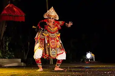 Baris dance (Balinese: ᬩᬭᬶᬲ᭄) is a family of traditional war dances in Bali, Indonesia, accompanied by gamelan, in which dancers depict the feelings of a young warrior prior to battle, glorify the manhood of the triumphant Balinese warrior, and display the sublimity of his commanding presence. Baris derives its name from the word bebarisan, which literally means "line" or "file formation", referring to the soldiers who served the ancient rajas of Bali.[1]