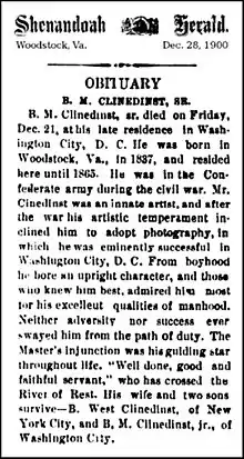 He died on December 28, 1900, in Washington, D.C. He was the father of Barnett McFee Clinedinst, who served as official White House portrait photographer for the Presidential administrations of Theodore Roosevelt, William Howard Taft, and Woodrow Wilson,[1][2] and Benjamin West Clinedinst, a painter.[4][5]