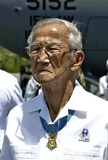 In 1948, he was awarded the Military Medal by the British government.[9] A 1990s review of U.S. military service records for personnel of Asian descent who had received the Distinguished Service Cross during World War II led to Hajiro's Distinguished Service Cross being upgraded to the Medal of Honor. President Bill Clinton presented Hajiro the Medal of Honor during a ceremony at the White House on June 21, 2000.[2] Twenty-one other former U.S. military personnel of Asian descent also received the Medal of Honor during the ceremony, fifteen of them posthumously. In 2004, the French awarded Hajiro the Legion of Honor.[10]