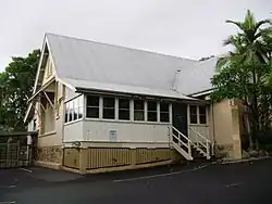 By the mid 1860s a school was needed in the rapidly growing Petrie Terrace area, and efforts commenced to raise the necessary funds. The long rectangular classroom with end porches and teachers room was erected in 1867 at a cost of around £400. The classroom was designed to accommodate 150 pupils, with separate "departments" for male and female students. Just over 300 students were enrolled at Petrie Terrace School by the end of 1868, although the average attendance for that year was 157 pupils.[1]