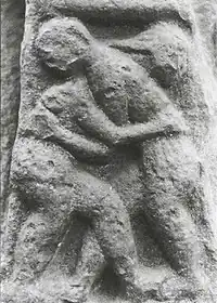 The characteristic backhold grip is mentioned in two separate 15th-century accounts of battlefield wrestling - one in the Cath Finntrágha[6] and another in the Táin Bó Flidhais.[7] The Mac Suibhne (Sweeney) clan of County Donegal incorporated backhold wrestling imagery on a 16th-century memorial slab for one of their more prominent members, Niall Mór Mac Suibhne.[8] The same clan once used a wrestling match to decide a dispute over leadership.[9] Such matches were a common form of entertainment in more recreational settings as well, as evidenced by Irish genealogist Edward MacLysaght's description of competitors at a 17th-century country fair wrestling in what he called a “hug” position.[10]