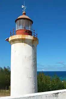 Barra Lighthouse (Portuguese: Farol da Ponta da Barra) is a lighthouse in southeastern Mozambique. The lighthouse stands on the Indian Ocean coast, at Barra Beach on the Ponta da Barra peninsula in Inhambane Province, 25 km drive from Inhambane city.[1] The beach is a major Mozambican tourist destination. Snorkeling is popular below the lighthouse at low tide where there is a natural tidal pool.[2] The wreck of the SS Inharrime, an Italian-built cargo ship that ran aground in 1949, lies exposed nearby.[3] The Barra and Tofo area is one of the global hotspots for divers to see whale sharks, sea turtles and manta rays.