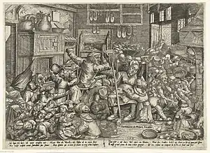 Bartholomeus de Momper's business suffered terribly as a result of the Sack of Antwerp.[5] On 4 November 1576, mutinying Spanish tercios of the Army of Flanders began the sack of Antwerp, leading to three days of horror among the population of the city, which was the cultural, economic and financial center of the Low Countries. Some 7,000 lives and a great deal of property were lost. The savagery of the sack led the provinces of the Low Countries to unite against the Spanish crown. The devastation also caused Antwerp's decline as the leading city in the region and paved the way for Amsterdam's rise.[10] This rampage of Spanish soldiers in Antwerp caused significant financial loss to Bartholomeus de Momper. All his art stalls were sacked and his residence was plundered. As the tenant of the Schilderij Pand which he leased from the city government, Bartholomeus de Momper petitioned for a waiver of the rental payments on the ground that he was unable to operate his business for a while. The city magistrate only agreed to grant a waiver of the rental payment for half a year and instructed de Momper to ensure that his sub-lessees would return to operate their business in the Schilderij Pand. Bartholomeus de Momper resumed trade at seven art stalls in January 1577. Not long after, a new threat arose in Antwerp when German soldiers started to plunder the city and broke into the exchange where they pillaged all they could lay their hands on.[5] After the Fall of Antwerp in 1585 de Momper had difficulty finding tenants for the stalls in the Schilderij Pand, but not because the art trade was in decline. The reason was that art dealers were running their trade on a lower floor of the bourse where they could display their paintings without having to rent the more expensive stalls in the Schilderij Pand from de Momper.[9]