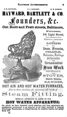 Separately, David Lewis Bartlett, another manufacturer from New England, moved to Baltimore around 1844, and established a stove foundry, first on President Street and later (in 1849) on Leadenhall Street.[22][3][23] Shortly after Hayward & Company's merger with the Latrobe Foundry, Bartlett also joined the partnership. Consequently, the firm became known as Hayward, Bartlett and Company.[3] The firm was by this time completely owned by the Bartletts and Haywards, Samuel Blanchard having withdrawn in 1842.[21]