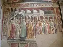 The cycle begins in the lunette on the left wall, portraying the Espulsion of Joachim from the Temple and the Annunciation to Joachim. Below are the Meeting of Joachim and Anne and Anne at the Golden Gate, set in a fanciful Jerusalem with high tower, belfries and other edifices painted in pink. The water of a stream where several youths are drinking is a symbol of Mary as the source of life, while the sea is a hint to her attribute as Stella Maris ("Star of the Sea") and the islet a symbol of virginity. The stories continue in the middle part of the end wall, with the Nativity of the Virgin, following the same scheme of Pietro Lorenzetti's Nativity of the Virgin, with Jesus bathing, and the Presentation of the Virgin at the Temple. The latter scene contains several numerology hints in the steps (three and seven, the number of the Theological virtues and all the Virtues respectively) and in the arches of Solomon's Temple (three like the Holy Trinity).