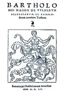 Bartolomeo Maggi (Latinized as Bartholomeus Maggius) (August 1477 – 7 April 1552) was an Italian military surgeon who spent several years of his life on the battlefields treating, soothing, and healing the most desperate wounds.[1] The experience he gained in this field lead him to write a work on surgeries in wartime De Vulnerum Sclopetorum, et Bombardarum Curatione Tractatus (1552) which was the first to deal with gunshot wounds. The Latin term Vulnus sclopetarium referring to gunshot wounds was first used by him.[2] His work was published posthumously by his brother Giovanni Battista.