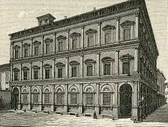 Other works in Bologna that have been attributed to him include the Palazzo Poggi (1549), Palazzo Vizzani (1549-1562) and Palazzo Malvezzi de' Medici (1560).[3] He was apparently given the commission for the Palazzo Poggi by the Bishop Giovanni Poggio shortly before he was elevated to Cardinal.[9][lower-alpha 1] However, other sources attribute the design of the Palazzo Poggi, which was built between 1549 and 1560, to Pellegrino Tibaldi.[11] The Palazzo Malvezzi dates back to the 12th century. It was rebuilt after Triachini's design, with the work starting in 1560. The building is now the seat of the Provincial administration.[12]