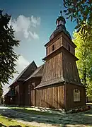 The wooden parish church of St. Erasmus was built in the second half of the 18th century. It was financed by the district landlord, Jan Biberstein-Starowieyski. The spire is a remnant of the previous 16th-century church of the Assumption of the Blessed Virgin Mary. The layout, in which the spire is located to the east of the chancel, is unusual and rarely found. There is polychrome decoration dating from the end of the 18th century, which features figurative, vegetative and geometric motifs. On the chancel ceiling you can see a painting of The Assumption of the Blessed Virgin Mary, while in the nave there is The Transfiguration of Our Lord on Mount Tabor. The main altar contains an 18th-century painting of St. Erasmus.[1]