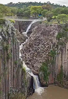 The canyon walls, called the Barranca de Santa María Regla, are lined by polygonal columns between 30 and 50 metres (98 and 164 ft) high, with five or six sides each.[3] The basalt columns were created by the slow cooling of volcanic lava. The visible columns are backed by even more polygonal basalt columns. There are two waterfalls. The higher one has its water supplemented by diversions from nearby dams.[3] The lower one is called the Cascada de la Rosa.[3][4] The natural canyon has been modified by the addition of stairs, walkways and hanging bridges for easier access.[4]