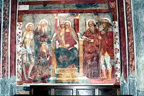 In the second right bay: in the rib vaults Doctors of the Church with the Evangelists' symbols; on the wall Virgin Mary in throne with baby Jesus among Saint Sebastian, Saint James, Saint Julius, Saint Roch and a devotee.[8]