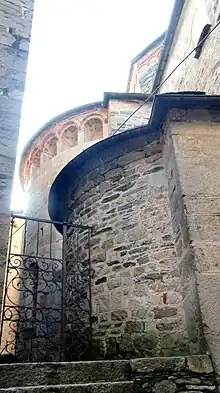 The entrance for the visitors of the basilica is on the south side, almost entirely hidden by the ancient Bishop palace (today nuns monastery); it can be reached from the jetty through a renaissance portal and a vaulted stair. The basilica has three apses (one entirely hidden by the sacristy); the central one is constructed with ashlars and decorated with a Lombard frieze.
