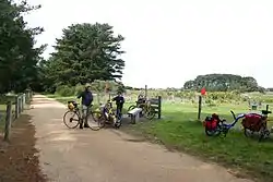 From Anderson to Kilcunda the trail drops 40 metres (130 ft) in height as it winds down through farming country. Here, the gravel path is overgrown and trail users need to negotiate several gates. The rail trail at Kilcunda is built on the coastal sand dunes and incorporates a landmark trestle bridge over Bourne Creek. Path users have panoramic scenic views of the Bass Strait coast and the Wonthaggi Wind Farm that was erected during 2005.
