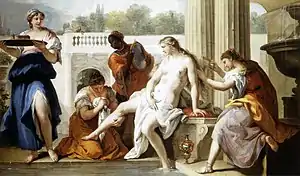 The painting depicts the Biblical story (as narrated in 2 Samuel 11) of the seduction of Bathsheba, the wife of Uriah the Hittite, by the Israelite king, David. In the painting Bathsheba, attended by four maidservants, is taking a ritual bath in the open air whilst being observed by King David from his nearby palace roof. In common with other artists Ricci portrays Bathsheba as somewhat vain and promiscuous, thereby excusing David's subsequent immoral behaviour, which was to send her a letter inviting her to his quarters and making her pregnant.[1]