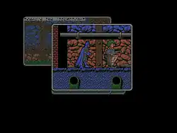 Batman: The Caped Crusader is an arcade adventure which uses a unique style, innovated by Jonathan Smith and Charles Davies, to display the action as though it takes place in a comic book.[2] This technique involved having each game location set in its own panel, often with a comic book style caption in the upper-left corner, with inactive panels faded out behind the current active location. This concept was expanded upon by Sega's Comix Zone seven years later.[3]