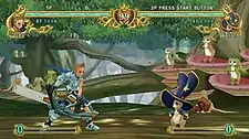 Battle Fantasia is a traditional versus fighting game where up to two players compete against each other in combat using a variety of characters each with their own special attacks and fighting styles. While the game uses three-dimensional graphics for characters, they are restricted to a two-dimensional battle area that only allows them to move back and forth or up into the air.[5] Players face each other in best-of-three round battles that involve the use of normal attacks, throws, and special moves that often involve combinations of button presses and directional input, which can be strung together in long combo strings. The game features four main attack buttons - two punches and two kicks - as well as a fifth "Gachi" (ガチ lit. "elegance" or "grace") button used to parry incoming attacks.[6] If a player times a Gachi command just as an opponent's attack lands, it negates all damage and allows the player to counterattack in a brief time frame. The button can also be used to push an opponent back when combined with a direction, as well as allow the player to recover faster from a knock-down.[6]
