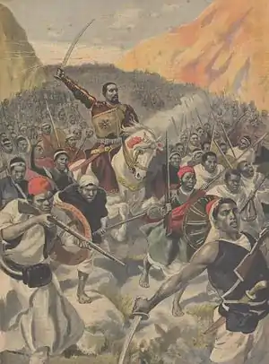 The Ethiopians attacked a force of 350 Eritrean irregulars on the left flank, who collapsed under the Ethiopian assault, causing Toselli to send two companies of Italian infantry who halted the Ethiopian advance.[3] Just as Toselli was rejoicing in his apparent victory, the main Ethiopian assault came down on his right flank, causing Toselli to order retreat. The Emperor's best general, Ras Makonnen, had occupied the road leading back to Eritrea, and launched a surprise attack, which routed the Italians.[3] The Ethiopians had completely devastated the Italians, who suffered 19 Italian officers (including Maj Toselli), 20 Italian other ranks, and 1,500 ascari killed, and 3 officers and 300 ascari wounded.[4]