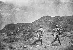 The Battle of Amba Alagi was fought in May 1941, during World War II, part of the East African Campaign. After the Italian defeat at Keren in April 1941, Prince Amedeo, Duke of Aosta withdrew his forces to the mountain stronghold at Amba Alagi. The mountain had galleries carved into the rock to protect the defending troops and hold ample ammunition and stores and the Italian troops thought themselves to be impregnable. According to other sources, however, the fortress was easily defendable thanks to its position and the mountainous terrain, but lacked food and water, so that Marshal Enrico Caviglia later criticised the Duke for having chosen it for his last stand, calling the Amba Alagi "uno scoglio senz'acqua e senza viveri" ("a rock with neither water nor food").[3][4] The initial attacks on the approaches to Amba Alagi by British troops under Major-General Mayne from the north, commenced on 4 May with a pincer from the eastern and western sides.
