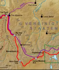 After sustaining heavy casualties at the Battle of the Big Hole on August 9–10, the Nez Perce proceeded southward though Montana Territory, crossed into Idaho Territory again at Bannock Pass, and descended into the valley of the Lemhi River. The Nez Perce were aware that the U.S. Army was in pursuit; to confound them, they took a circuitous route less familiar than their usual direct route to the Montana Great Plains. During this section of their retreat, their guide and the leader of their march was a half-Nez Perce, half-French man of several names, the most common being Poker Joe.[4] The White settlers in the Lemhi Valley had been warned that the Nez Perce might be coming their way and most of them had fled to the town of Lemhi.