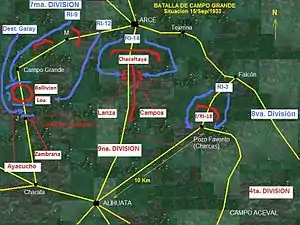 The Battle of Campo Grande was a major engagement which took place during the Chaco War, in the southern region of the Chaco Boreal. During this battle, the Paraguayan Army successfully encircled two Bolivian regiments defending two of the three flanks of Fort Alihuatá, forcing them to surrender.