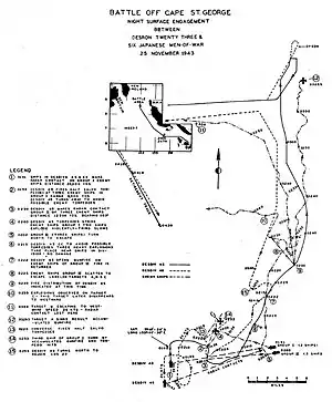 The Battle of Cape St. George was a naval battle of the Pacific campaign of World War II fought on 25 November 1943, between Cape St. George, New Ireland, and Buka Island (now part of the North Solomons Province in Papua New Guinea). It was the last engagement of surface ships in the Solomon Islands campaign. During the engagement, a force of five US Navy destroyers led by Captain Arleigh Burke intercepted a similar sized Japanese force that was withdrawing from Buka towards Rabaul, having landed reinforcements on the island. In the ensuing fight, three Japanese destroyers were sunk and one was damaged, with no losses amongst the US forces.