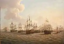 After also resupplying Minorca, Rodney sailed for the West Indies in February, detaching part of the fleet for service in the Channel. This homebound fleet intercepted a French fleet destined for the East Indies, capturing one warship and three supply ships.[26] Gibraltar was resupplied twice more before the siege was lifted at the end of the war in 1783.[27] Admiral Lángara and other Spanish officers were eventually released on parole, the admiral receiving a promotion to lieutenant general.[28] He continued his distinguished career, becoming Spanish Navy Minister in the French Revolutionary Wars.[29] Admiral Rodney was lauded for his victory, the first major victory of the war by the Royal Navy over its European opponents. He distinguished himself for the remainder of the war, notably winning the 1782 Battle of the Saintes in which he captured the French admiral, Comte de Grasse. He was, however, criticised by Captain Young, who portrayed him as weak and indecisive in the battle with Lángara.[14][30] (He was also rebuked by the admiralty for leaving a ship of the line at Gibraltar, against his express orders.)[31] Rodney's observations on the benefits of copper sheathing in the victory were influential in British Admiralty decisions to deploy the technology more widely.[26][32]