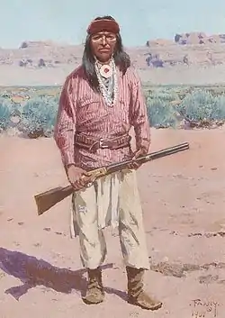 Nock-ay-det-klinne was a respected Cibecue Apache medicine man and was chief of the Cañon Creek band of the Cibecue Apache, a group of the Western Apache. He often counseled leading warriors such as Cochise and Geronimo. Due to corruption and unhealthy conditions at the Fort Apache Indian Reservation in eastern Arizona, Nock-ay-det-klinne began holding ceremonies known as ghost dances at the village of Cibecue. It was part of a late-19th-century spiritual revival among Native Americans struggling to deal with the disruption of their societies as they were pushed onto reservations. The ceremonies often included heavy drinking and the use of hallucinogenic plants, such as peyote. Through them, the Apache expressed and united under their discontent with conditions of reservation life. The American settlers of the region grew alarmed about the dances, which they thought were related to preparations for war. The Army came to investigate the situation and remove the medicine man from his followers.