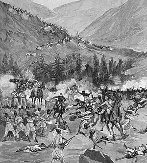 A great commotion is visible in the hostile camp. Notwithstanding the sudden surprise, rapidly increasing groups of warriors swarm out with great promptitude and dash, advancing through the winding paths and small gorges, crossing them with wonderful agility, concealing their numbers, shielding themselves with their obstacles. They offer us only a small mark as they disappear from time to time, and gather in greater numbers under the cover of the defenses.