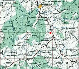 The return to Khénifra was initially hampered by attacks by small groups of tribesmen who were beaten off, but discovered the relatively small number of troops in the French column.[15] Word was passed to others and soon a force, estimated at 5,000 by the French, was assembled.[2][15] These men consisted of almost the entire Zaian tribe and elements of the Mrabtin, Aït Harkat, Aït Ischak and Aït Ichkern (the latter, seeing the French falling back, had changed allegiance once more).[17][20] Zaian tactics were to harass the flanks and rear of the column and to occupy any convenient high ground for sniping attacks.[19] The French found they could not move in safety without heavy covering fire from the artillery, which was reduced in effectiveness by the dispersed positions of the Zaian tribesmen and their use of cover.[2][19] Hammou's nephew, Moha ou Akka, led a force of several thousand tribesmen around the French to cut off their route back to Khénifra.[16]