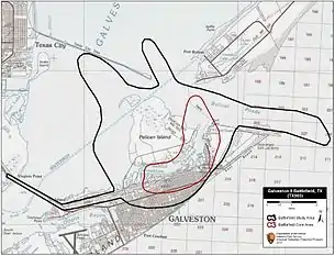 Map of Galveston Battlefield core and study areas by the American Battlefield Protection Program.