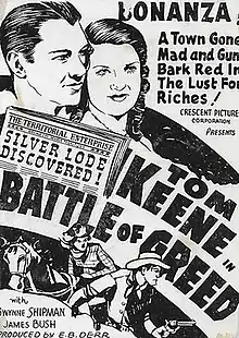 Battle of Greed is a 1937 American Western film directed by Howard Higgin and starring Tom Keene, Gwynne Shipman and James Bush.[1] A silver strike in Virginia City leads to cutthroat completion to exploit the discovery.