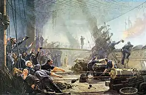 Top: Another painting of the battle, Slaget ved Helgoland, depicting the Danish ships in the foreground with the burning Schwarzenberg on fire in the distance. Bottom: Aboard the frigate Niels Juel at the Battle of Heligoland by Christian Mølsted