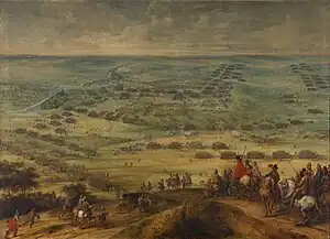 ![]() The Battle of Honnecourt, by Peter Snayers.[1] Perspective from the Spanish positions; note Abbey on left, and River Escaut directly behind | |||||||