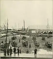 Capt. Morton's guns bombarded the Union supply depot, and the 28 steamboats and barges positioned at the wharf. All three of the Union gunboats—Key West, Tawah, and Elfin—were disabled or destroyed.[8] The Union garrison commander ordered the supply vessels burned to prevent their capture by the Confederates. Forrest observed, "By night the wharf for nearly one mile up and down the river presented one solid sheet of flame. ... Having completed the work designed for the expedition, I moved my command six miles during the night by the light of the enemy's burning property."[9]