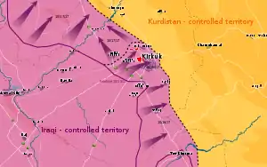 The Battle of Kirkuk (2017), part of the 2017 Iraqi–Kurdish conflict, was a military deployment by the Iraqi Security Forces to retake Kirkuk Governorate from the Peshmerga after the latter ignored repeated warnings to withdraw,[17] sparking clashes between the two forces.[18] The advance began on 15 October 2017, with the city of Kirkuk being retaken the following day. Iraqi central government forces continued their advances in subsequent days, routing the Peshmerga forces across vast swathes of territory in northern Iraq.[1]