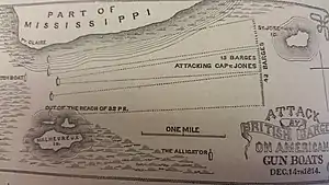 At night on December 12, the British rowboats, under Lockyer, set off to enter Lake Borgne, to attack the gunboat squadron.[13] Jones sighted the British rowboats on December 13 at 10:00am believing them to be disembarking troops, advancing in the direction of Pass Christian and then stopping. When he saw their route at 2:00pm, advancing past Pass Christian without stopping, he realized they were heading to attack his gunboats.[13][23] The shallow waters caused Jones issues, three of his gunboats being in 12 or 18 inches water less than their draught, which was resolved by the flood tide at 3:30pm.[13][24]