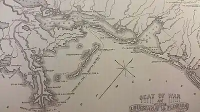 In August 1814, Vice Admiral Cochrane had convinced the Admiralty that a campaign against New Orleans would weaken American resolve against Canada, and hasten a successful end to the war.[lower-alpha 1] In the winter of 1814, the British had the objective of gaining control of the entrance of the Mississippi, and to challenge the legality of the Louisiana Purchase.[7] To this end, an expeditionary force of about 8,000 troops under General Edward Pakenham had arrived in the Gulf Coast, to attack New Orleans.[8] An anonymous letter sent from Pensacola, dated December 5 and addressed to Commodore Daniel Patterson warned him of this imminent threat,[9] and was received on December 7.[10] Patterson dispatched Lieutenant Thomas ap Catesby Jones and a small flotilla to wait outside of the Rigolets heading eastward, towards the passes Mariana and Christiana (marked on Lossing's map, close to Cat Island), to watch the movements of the British vessels.[11]