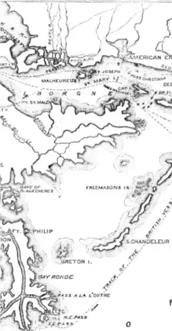 Jones's squadron headed back in the direction of the Rigolets, mooring at Bay St Louis on December 10. The following day, they prepared their boats to make an attack. On December 12 the squadron arrived at Cat Island, but found the overwhelming strength of the British would have been disadvantageous to the gunboats, so they returned in the direction of the Rigolets, and the fort at Petit Coquilles.[20] Owing to the strong current, they were only able to get as far as the channel between the mainland and Malheureux island on December 13.[21] Jones had been ordered by Patterson to position his gunboats across Pass Christiana (to the south of the modern day settlement of Ansley, Mississippi), at the mouth of Lake Borgne, then fall back to the Rigolets to make a stand.[22][17]