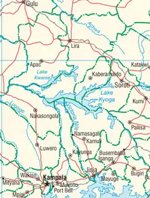 Map of central Uganda, including the main roads in red and Lake Kyoga in the center