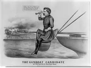The firefight also alerted the three Union boats on the James—the ironclad USS Galena, and the gunboats USS Jacob Bell and USS Aroostook[lower-alpha 6]—which began lobbing missiles twenty inches (510 mm) in length and eight inches (200 mm) in diameter from their position on the James River onto the battlefield.[59] The explosions and impacts of the gunboat fire impressed the Confederate troops, but the guns' aim was unreliable, and the large shells did considerably less damage than might have been expected.[60]