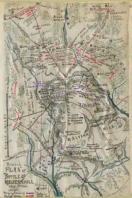 Battle of Malvern Hill; Confederate forces are indicated in red, and Union forces are indicated in blue.