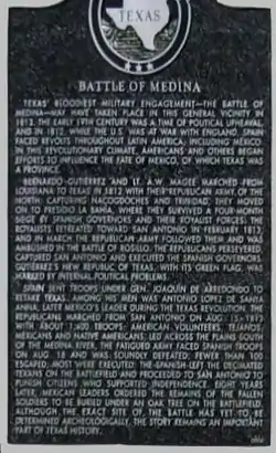 The Battle of Medina was fought approximately 20 miles south of San Antonio de Bexar (modern-day downtown San Antonio in the U.S. state of Texas) on August 18, 1813, as part of the Mexican War of Independence against Spanish authority in Mexico. Spanish troops led by General José Joaquín de Arredondo defeated republican forces (calling themselves the Republican Army of the North), consisting of Tejano-Mexican and Tejano-American revolutionaries participating in the Gutiérrez–Magee Expedition, under General José Álvarez de Toledo y Dubois. It was the deadliest battle in Texas history.