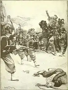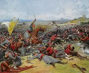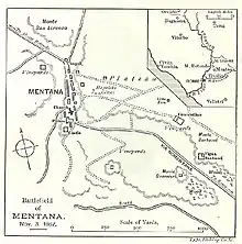 The Battle of Mentana was fought on November 3, 1867, near the village of Mentana, located north-east of Rome (then in the Papal States, now modern Lazio), between French-Papal troops and the Italian volunteers led by Giuseppe Garibaldi, who were attempting to capture Rome, then the main centre of the peninsula still outside of the newly unified Kingdom of Italy. The battle ended in a victory by the French-Papal troops.