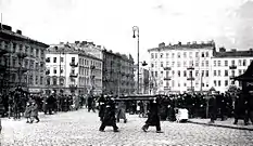 The first clash took place when the German units approached Nalewki Street in the morning of April 19 - the insurgents opened fire on them with machine guns and hand guns, forcing the Nazis to retreat in the afternoon. During the fights that day, two commanders of the ŻZW, Paweł Frenkel and Leon Rodal, dressed up as SS officers, approached a unit of Ukrainian soldiers grouped near the square and attacked them by surprise, breaking the encircling of the Jewish units and restoring their contact with the rest of the insurgents.[14] According to Kazimierz Iranek-Osmecki, later the head of the Home Army Main Command's Intelligence, the Germans, after capturing the ŻOB resistance point on Gęsia Street, attacked ŻZW positions at Muranów Square, commanded by Paweł Frenkel.[15]