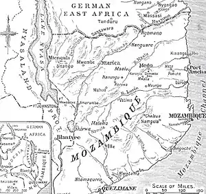 Although Tafel's force was intercepted by the Allies and capitulated before reaching the border, von Lettow-Vorbeck and his column was able to reach the Rovuma River. Facing supply shortages, the German general then reduced his force by dismissing a large number of Askaris, who could not be adequately equipped, as well as a number of camp followers.[5] With his reduced force, von Lettow-Vorbeck made plans to attack the Portuguese garrison across the river at Ngomano. The Portuguese force was a native contingent led by European officers under João Teixeira Pinto, a veteran with experience fighting in Africa.[6][lower-alpha 1] Rather than prepare defensive positions, the Portuguese had begun building a large encampment upon their arrival at Ngomano on 20 November. Pinto had at his disposal 900 troops with six machine guns and a large supply cache but his inexperienced force was no match for von Lettow-Vorbeck's force, which crossed the river with between 1,500 and 2,000 veterans as well as a large number of porters.[7]
