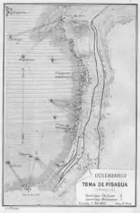 At two kilometres from the shore, the landing boats were ready for disembarking troops who were to establish a beachhead. At 10:15, the navy ceased its barrage and the boats began to move. But instead of 900 men, only 450 soldiers were embarked - two companies of the Atacama Battalion and another two of the Zapadores Regiment. Upon entering the northern side of Pisagua beach these Chilean infantry came within firing range of the Allied defenders' on the heights at Playa Blanca (White Beach).[5] Despite the heavy fire from the heights (shown on the Chilean military map accompanying this article to be heldby the Bolivians), the landing force started to return fire. Their situation was very difficult due to the lack of reinforcements and strong position of the defenders, but the Zapadores led by Ricardo Santa Cruz assailed the Allied positions on the hill slope. From the higher position, the Chileans would then be able to fire on the Allied positions lower down the slope and make the disembarking of their reinforcements less risky.[5] In support of the Zapadores attack the fleet opened fire again, this time over the train station at Alto Hospicio. Meanwhile, the Chilean first-wave troops endured 45 minutes of heavy fire until the second wave landed at 11:00.