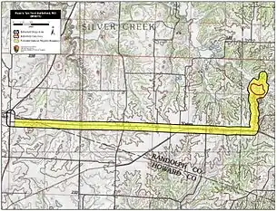 In December, Price sent recruiters into the central portions of Missouri, in the hope that men would volunteer to serve in his command. An additional goal was to raid the North Missouri Railroad on the night of December 20. Several hundred men volunteered for the raid on the railroad, and damaged a 100 miles (160 km) stretch of it by burning bridges; thousands of Missourians joined Confederate-supporting units in the period after the raid.[5] The Missouri State Guard then formed a camp in the vicinity of Yates, Missouri, in Randolph County, to attract and train new recruits.[6][7] While scouting near Silver Creek in January 1862, Union major, W. M. G. Torrence, of the 1st Iowa Cavalry Regiment, learned of the presence of a Missouri State Guard camp in the area.[8][9] While Union authorities had been aware of the existence of the camp for over a week, its location had not previously been established.[10] The Missouri State Guard outpost was under the command of Colonel John A. Poindexter.[10] An 1864 source estimated that Poindexter had around 1,000 men on hand.[7]